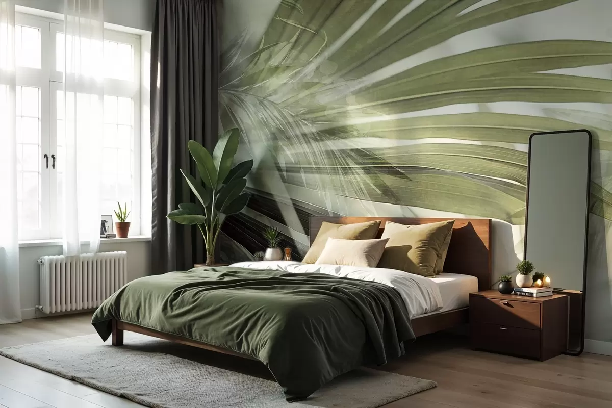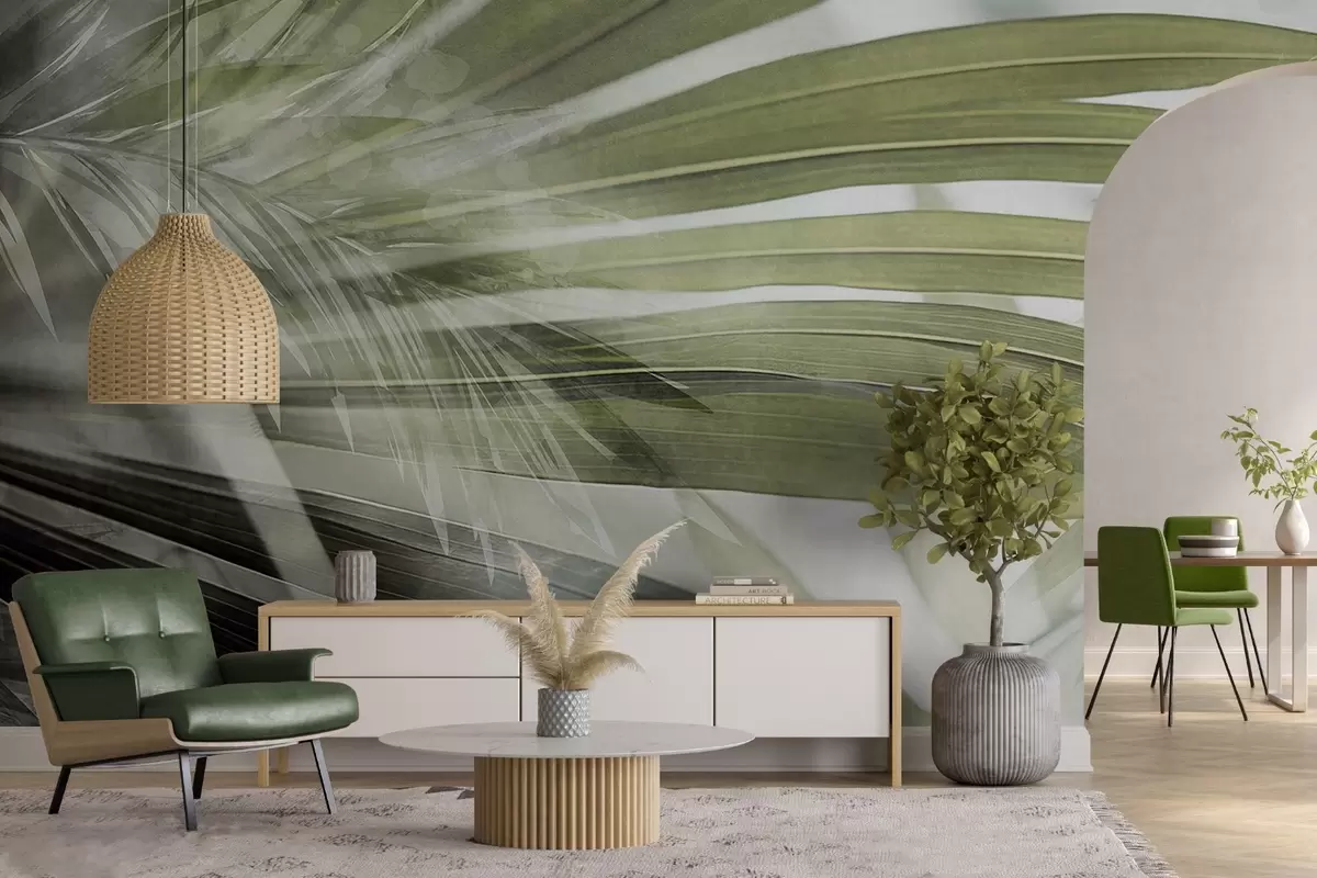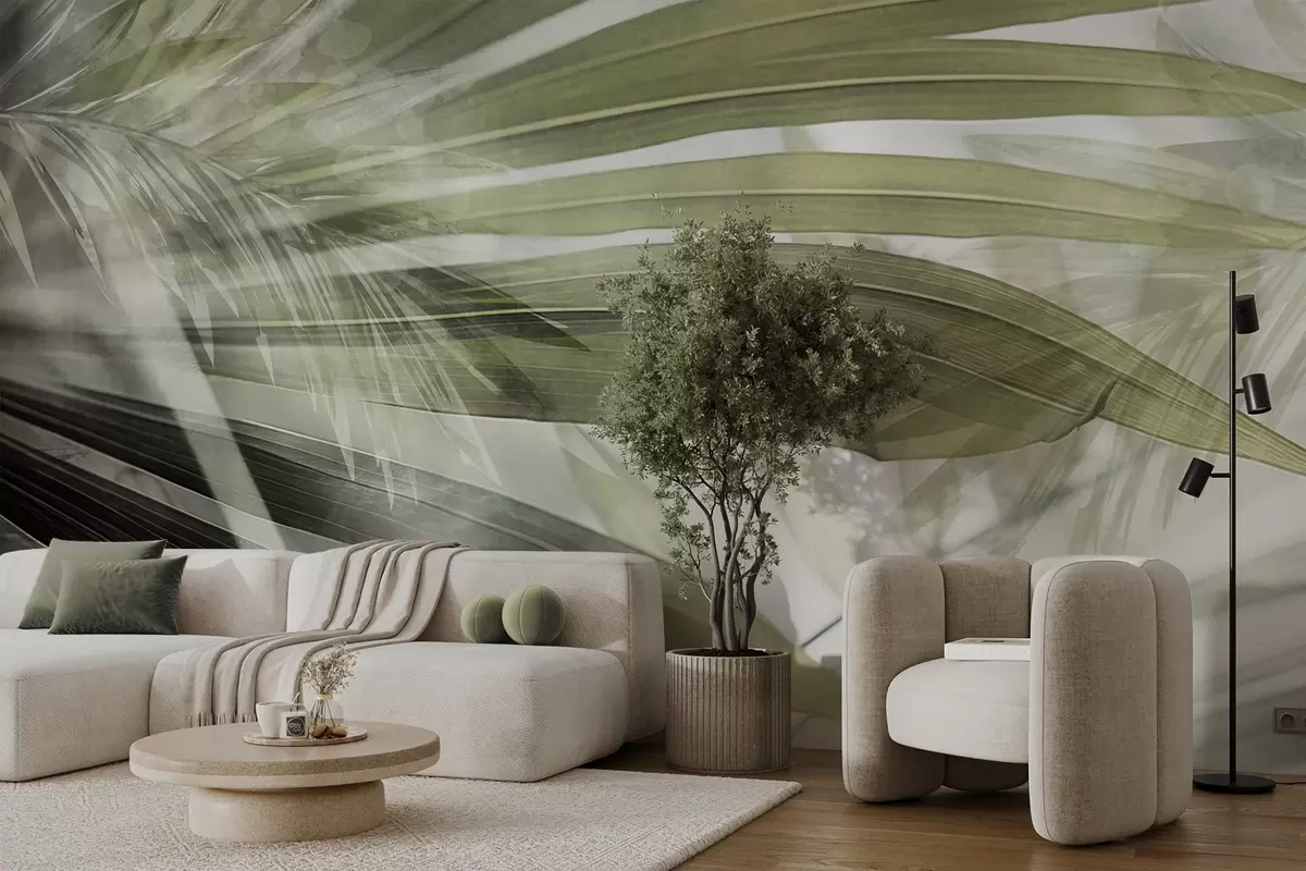 Тапете за зид Палмино лишће светлозелене нијансе, које се преклапа и ствара слојевити ефекат, на мекој, неутралној позадини бр. w09256v1