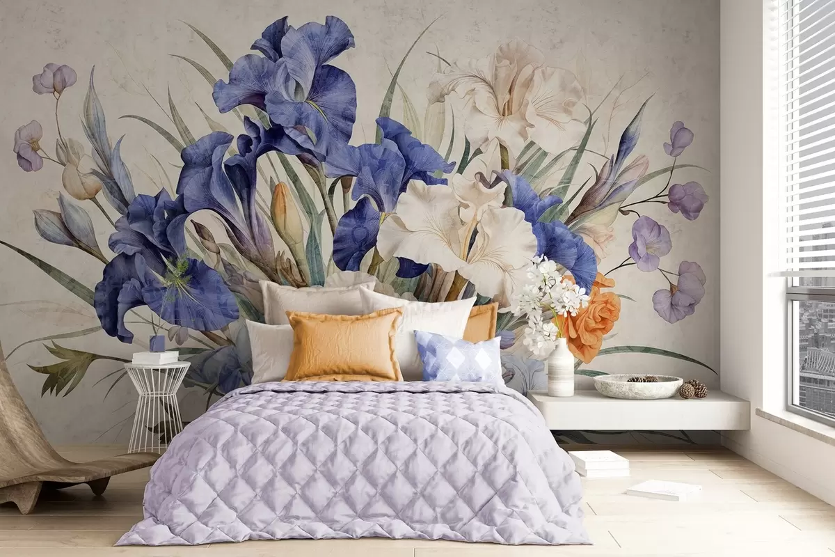 Тапете за зид Винтаж текстурирани букет љубичастих перуника, аранжиран са зеленим листовима и стабљикама, постављен на мекој позадини бр. w09263
