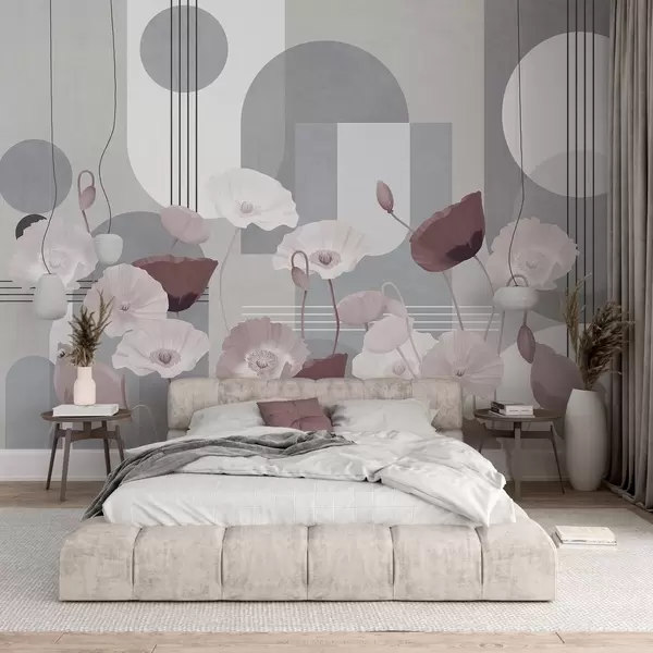 Тапете за зид Макови у белој и сивој боји са геометријским облицима у позадини, круговима и луковима, минималистички стил, меке боје бр. w09289v1