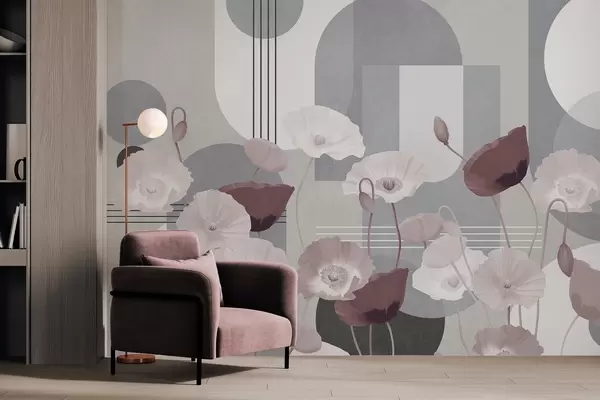 Тапете за зид Макови у белој и сивој боји са геометријским облицима у позадини, круговима и луковима, минималистички стил, меке боје бр. w09289v1