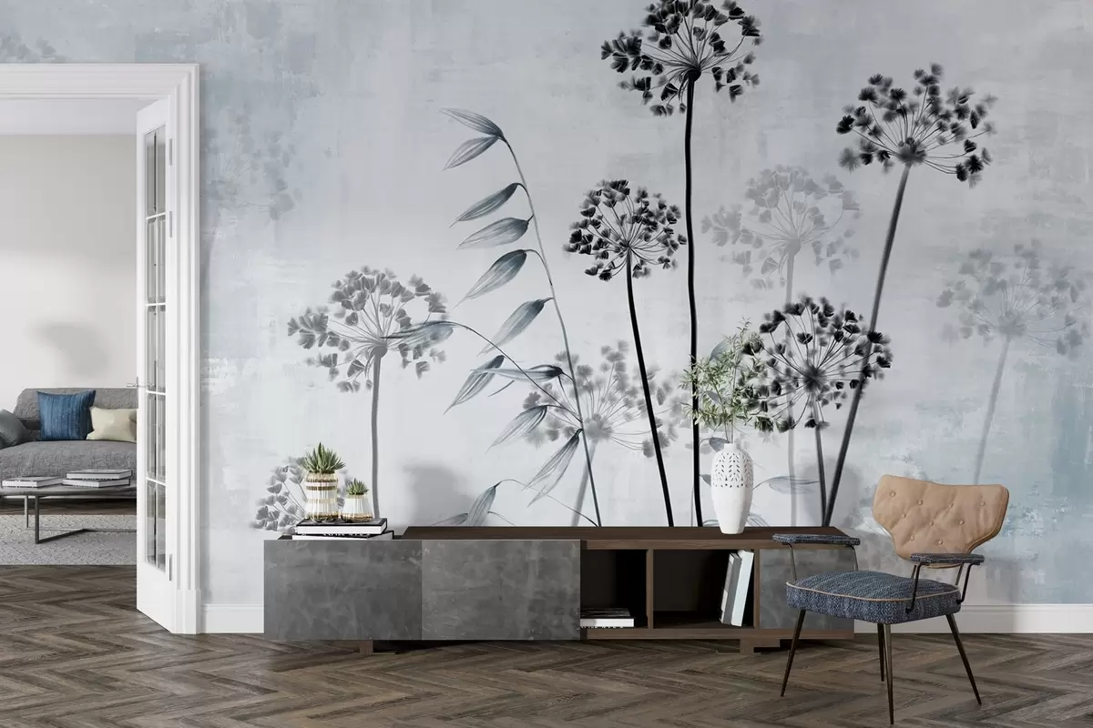 Тапете за зид Цртеж сушеног цвећа са дугим стабљикама, монохроматска палета, на текстурираној, светло сивој позадини, ботаничка илустрација бр. w09314