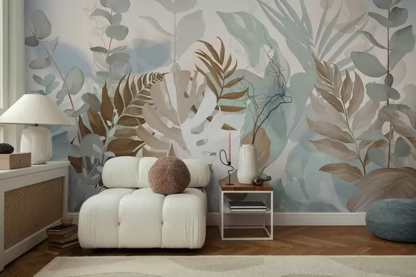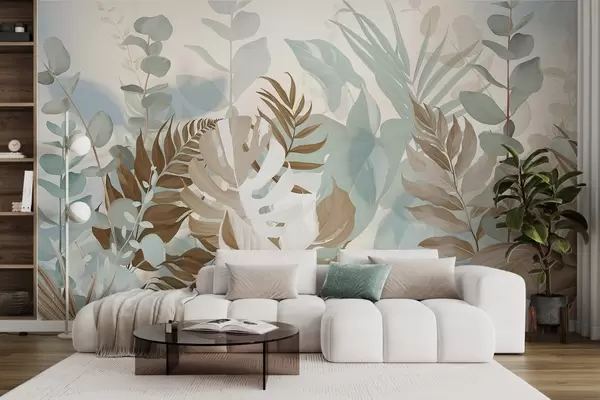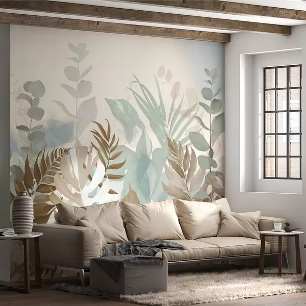 Тапете за зид Пастелне биљке папрати, монстера и еукалиптус, светла текстурирана позадина, меко осветљење, мирно, ботаничка илустрација бр. w09316v1