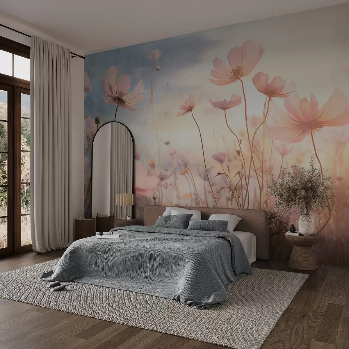 Тапете за зид Поље ружичастог текстурираног цвећа са дугим стабљикама, наспрам меког плавог и жутог неба, ствара сањиву атмосферу бр. w09320