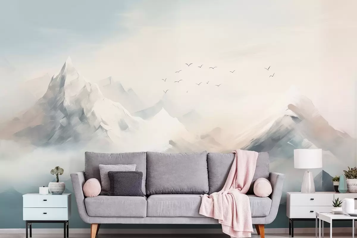 Тапете за зид Снежни планински врхови у јутарњој магли са птицама у лету бр. w09326