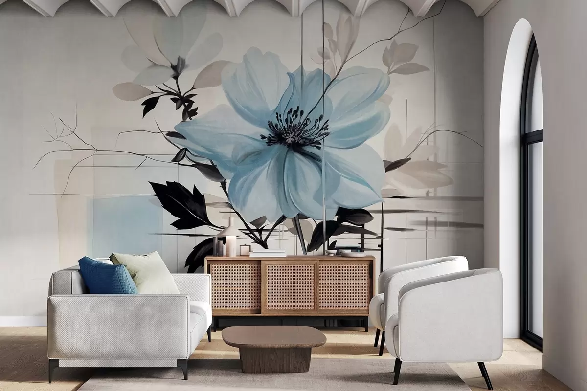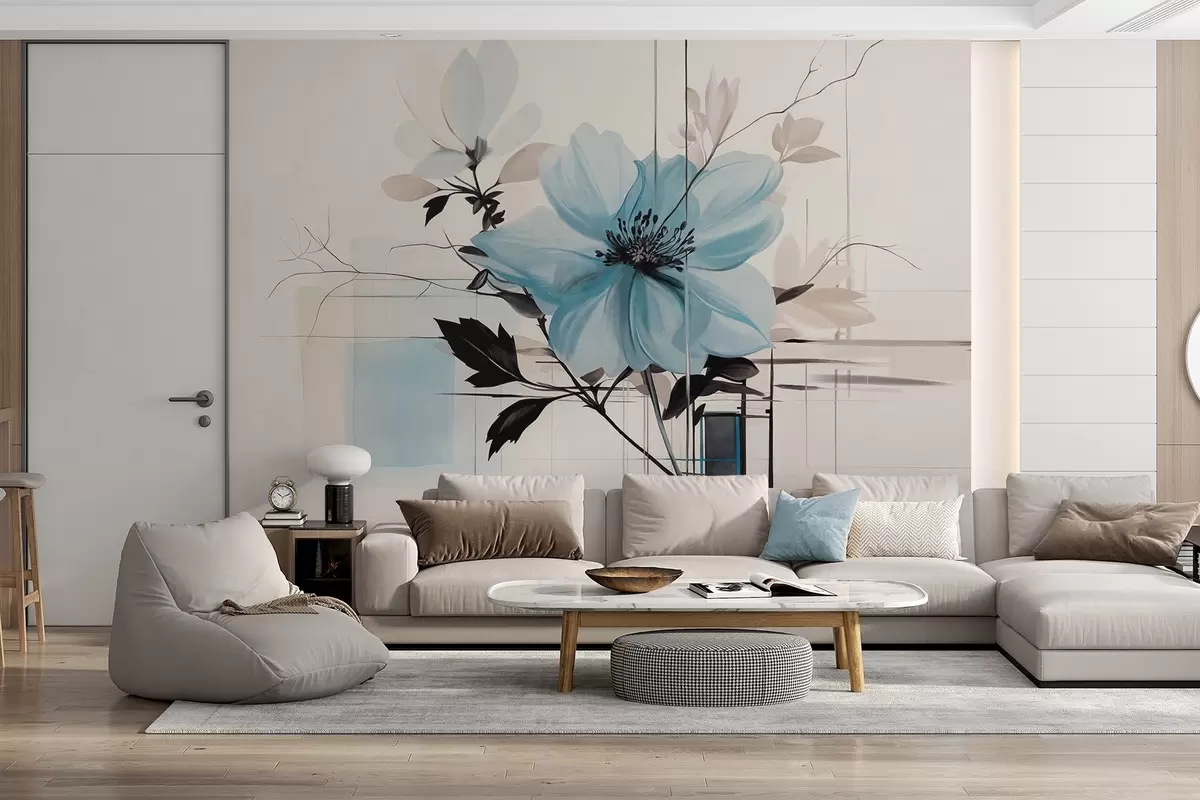 Тапете за зид Апстрактни текстурирани плави цвет са тамним листовима и гранама, геометријским минималистичким облицима и линијама у пригушеним бојама бр. w09332
