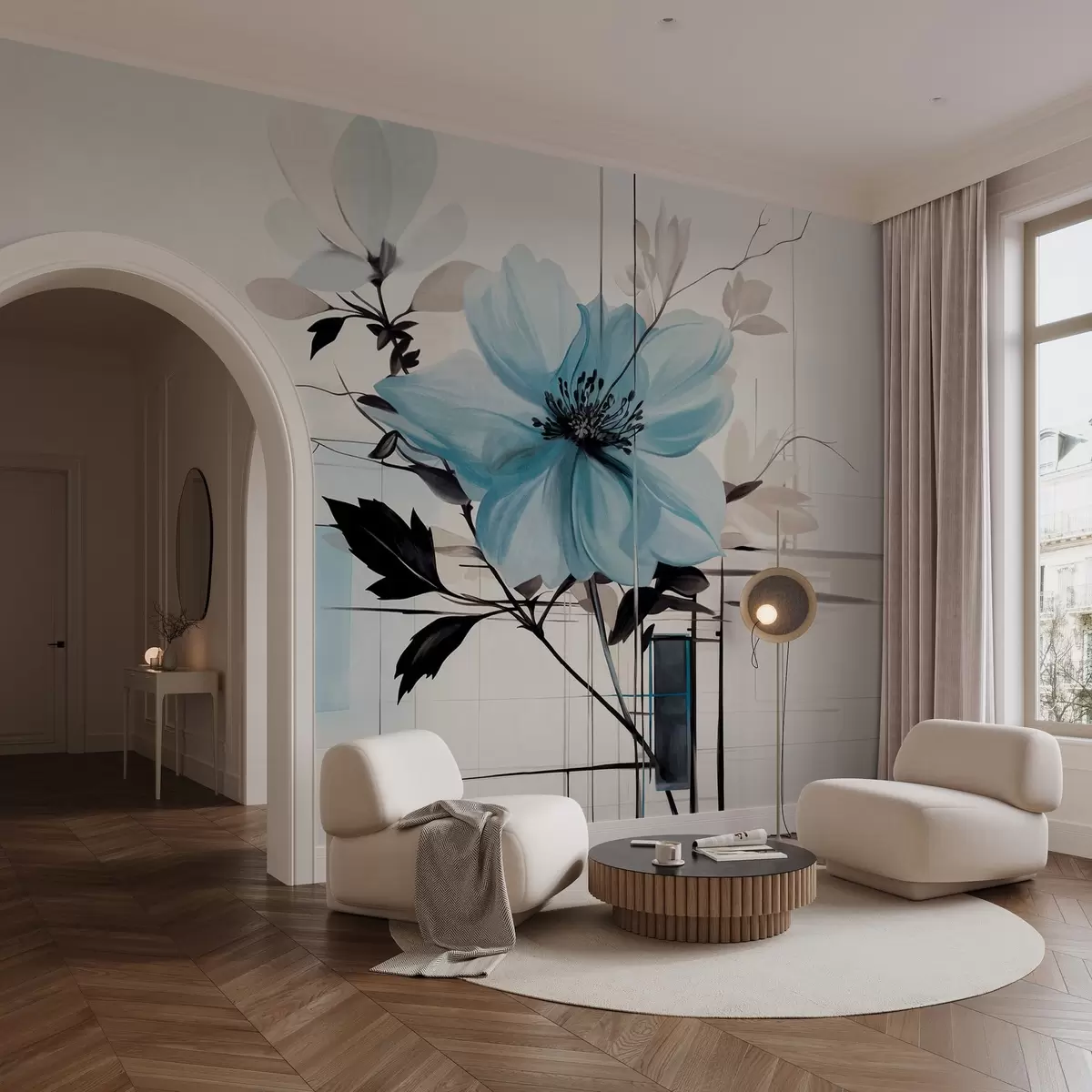 Тапете за зид Апстрактни текстурирани плави цвет са тамним листовима и гранама, геометријским минималистичким облицима и линијама у пригушеним бојама бр. w09332