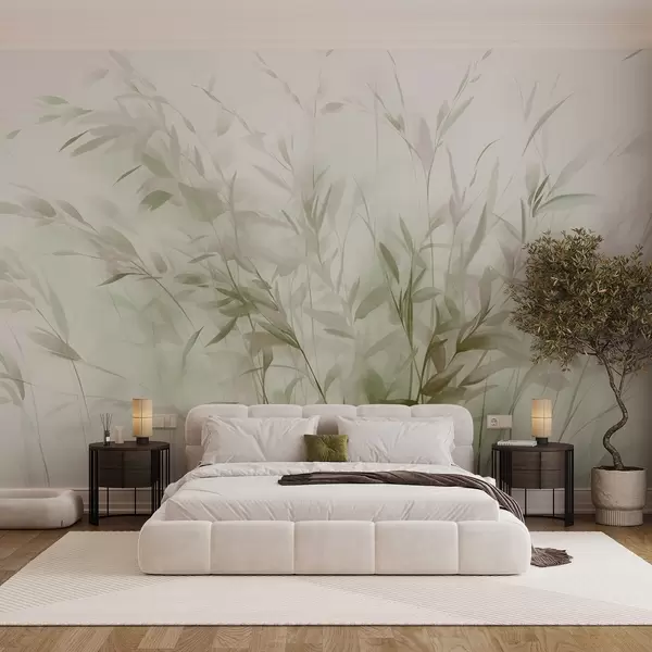 Тапете за зид Трава и коров са танким листовима и стабљикама, светло зелене и смеђе боје, меки и нежни потези четкицом, минималистички отисак бр. w09342