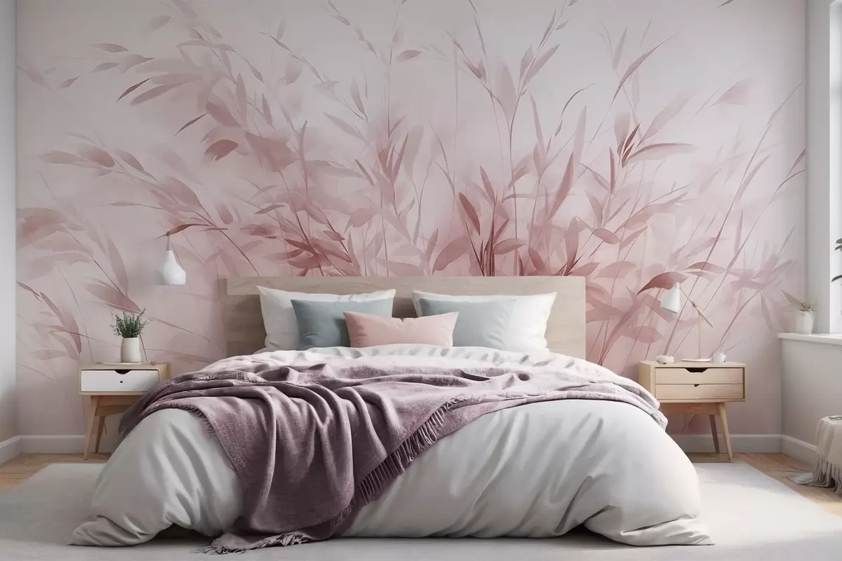 Тапете за зид Трава и коров са танким листовима и стабљикама, светло ружичасте боје, меки и нежни потези четкицом, минималистички отисак бр. w09342v2