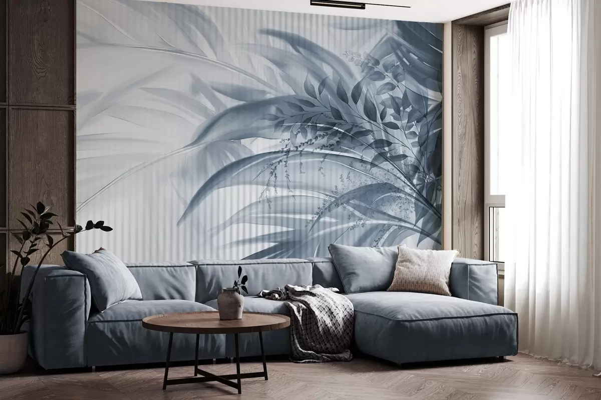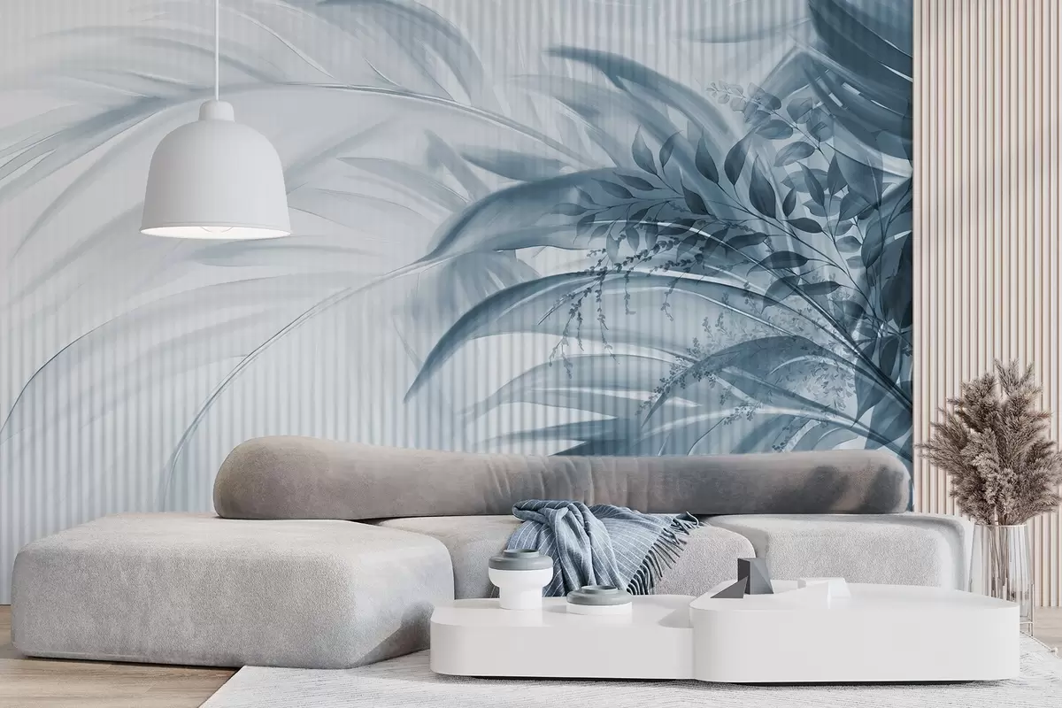 Тапете за зид Палмино тропско плаво лишће са белом пругастом позадином, меко осветљење, нежни потези четкицом, органски облици бр. w09343v1