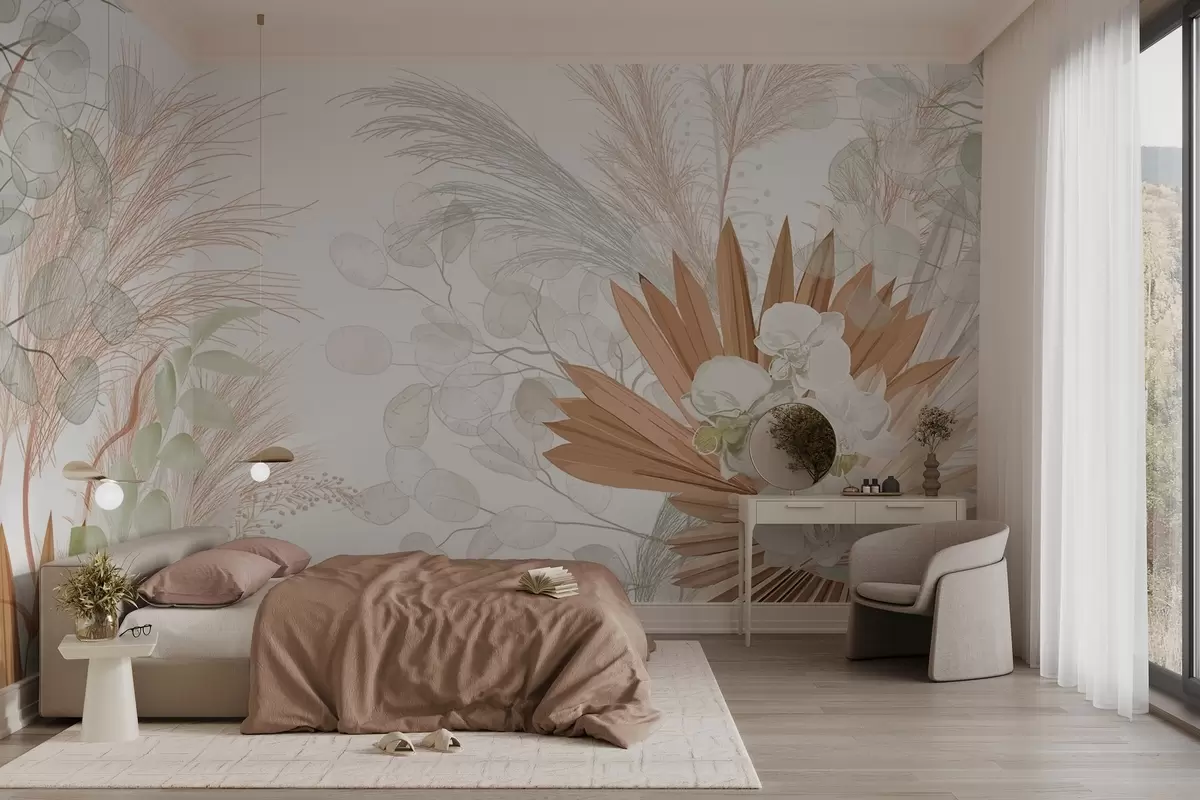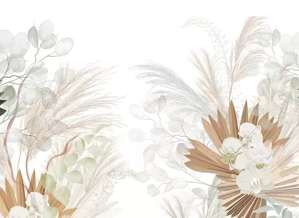 Тапете за зид Пампас трава, еукалиптус, тропско лишће и орхидеје на белој позадини, пастелне боје бр. w09366