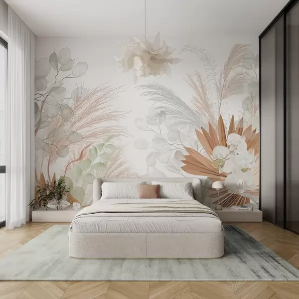 Тапете за зид Пампас трава, еукалиптус, тропско лишће и орхидеје на белој позадини, пастелне боје бр. w09366