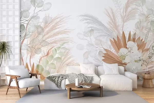 Тапете за зид Пампас трава, еукалиптус, тропско лишће и орхидеје на белој позадини, пастелне боје бр. w09366