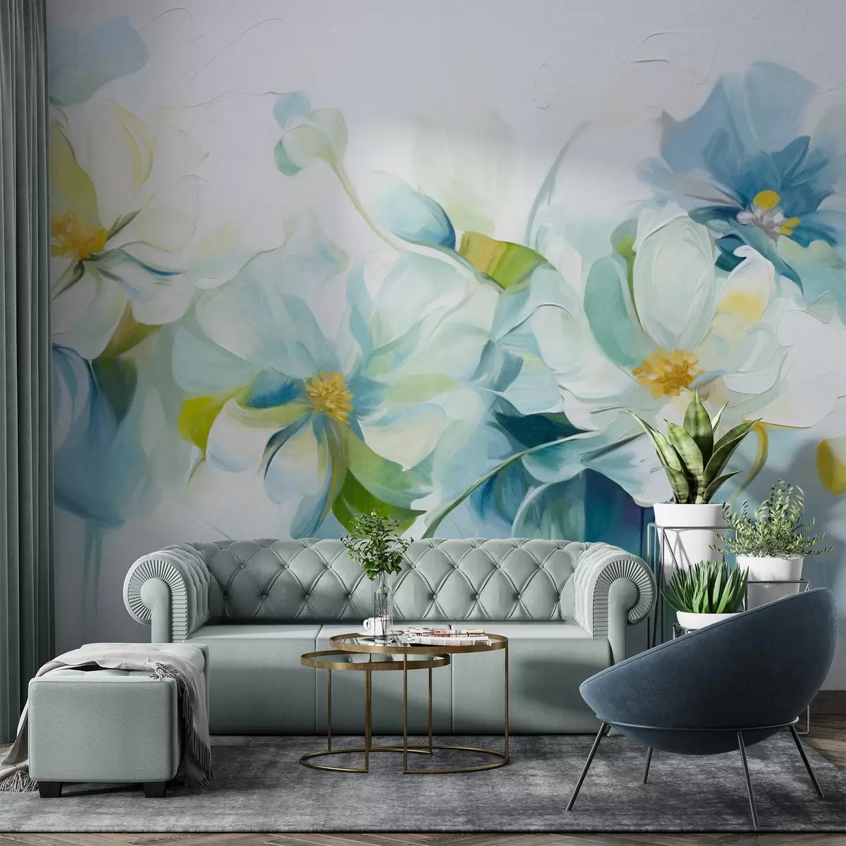 Тапете за зид Апстрактни бели и плави цветови са жутим тучковима и зеленим листовима, на белој позадини, текстурирани стил сликања бр. w09372
