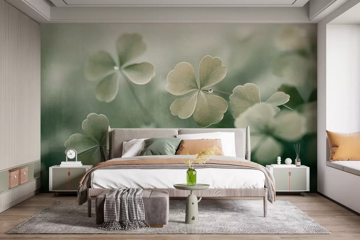 Тапете за зид Детелине са четири листа са капљицама воде, светло зелена боја, меки фокус, замућена позадина, текстурирани отисак бр. w09376