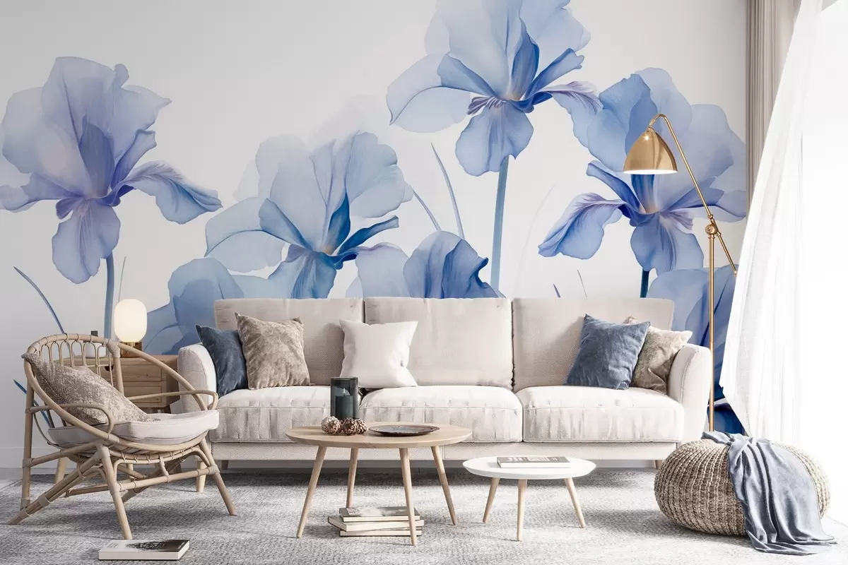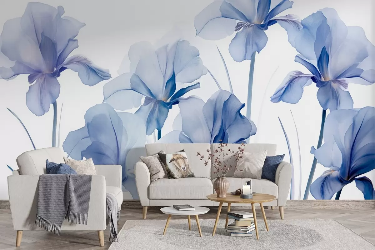 Тапете за зид Плави цветови ириса са провидним латицама и дугим стабљикама, распоређени у низу на плавој позадини, меки и текстурирани бр. w09379
