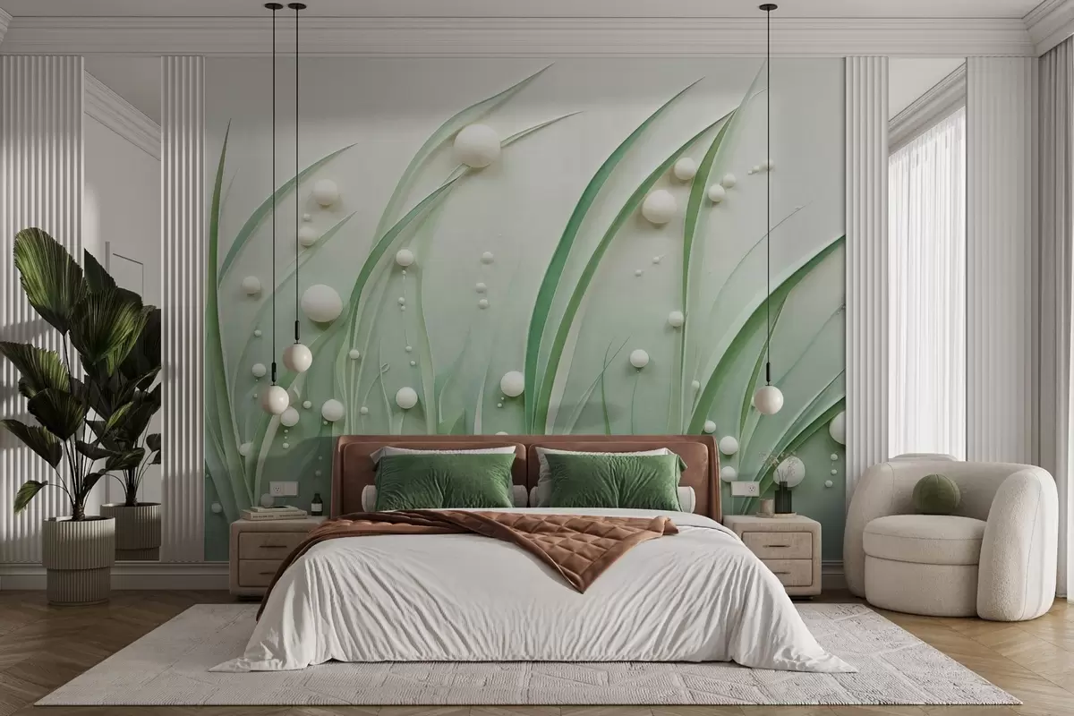 Тапете за зид Апстрактна зелена трава са белим сферама, светло зелена позадина, текстура, чисте линије, минималистички стил бр. w09382