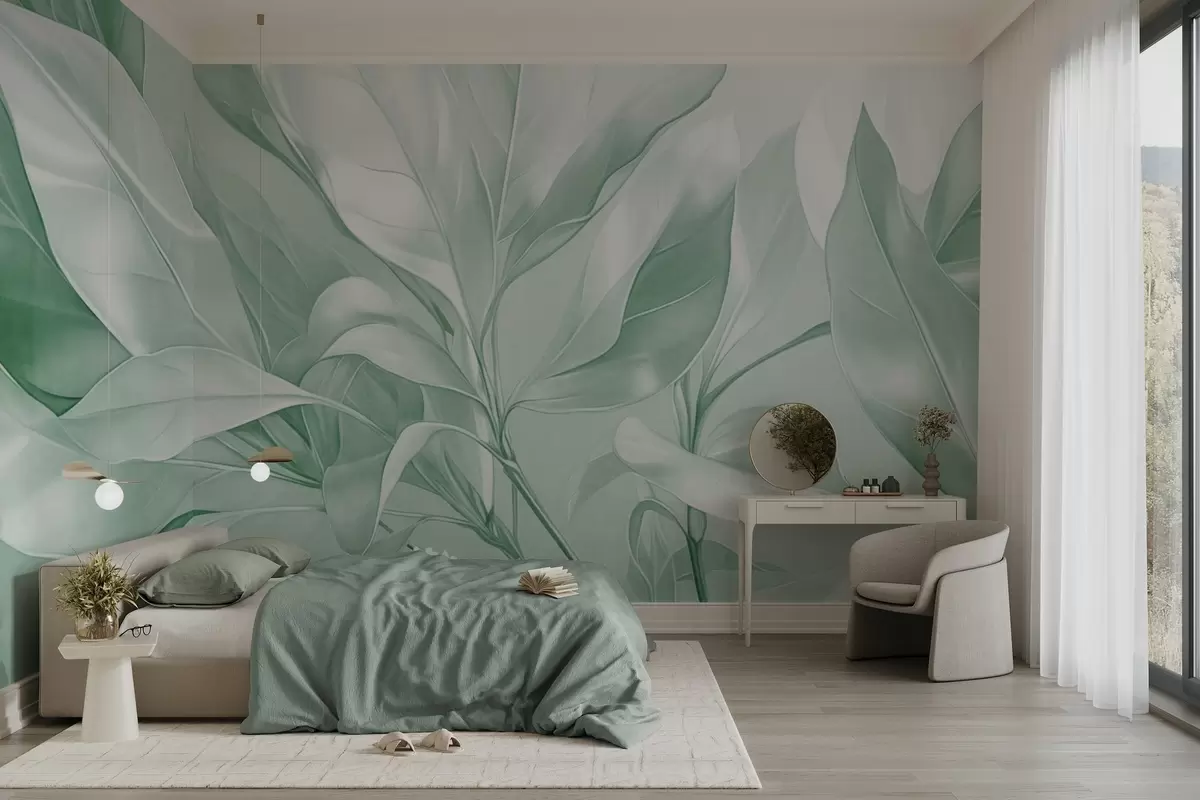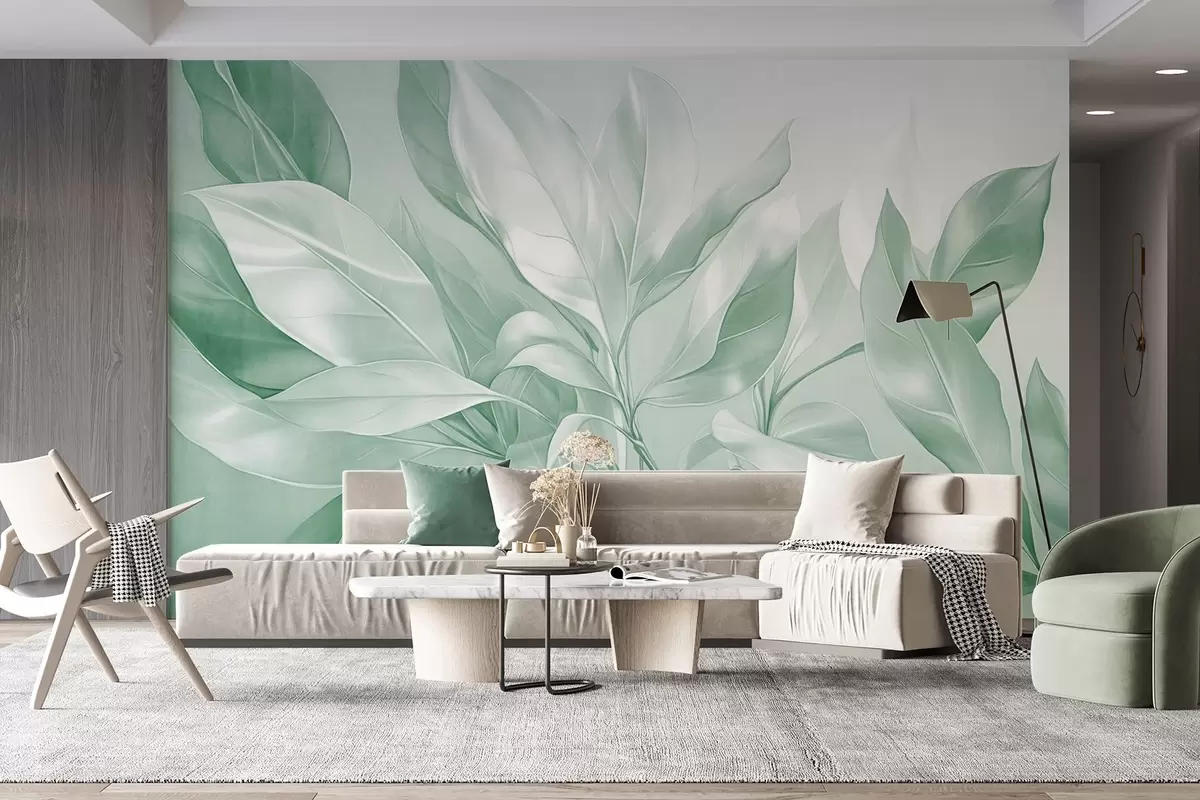 Тапете за зид Листови магнолије са белим и зеленим тоновима, меко осветљење, елегантна композиција, детаљне жиле листа, уметнички потези четкицом бр. w09385v1