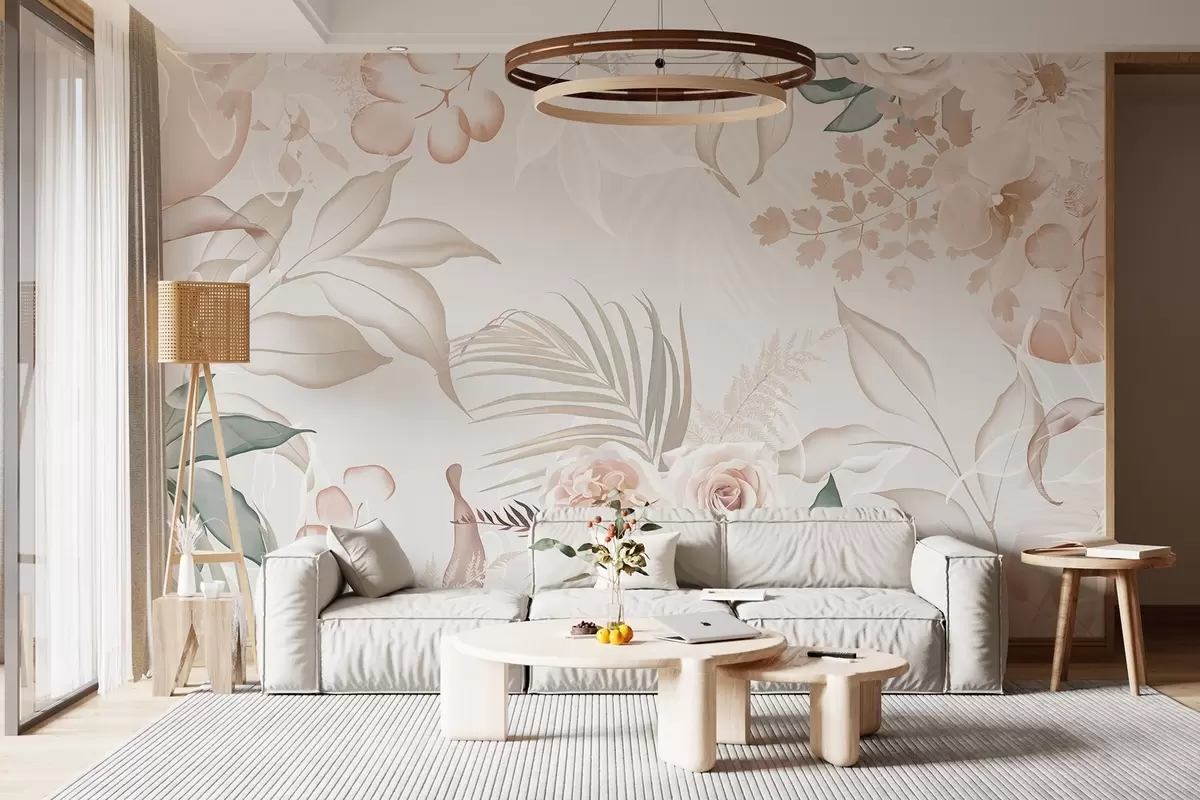 Тапете за зид Цветни текстурирани аранжман са ружама, орхидејама, еукалиптусом и палминим листовима у пастелним бојама, беж позадина бр. w09393