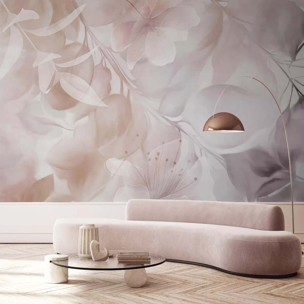 Тапете за зид Цветна уметност са пригушеним беж и смеђим цветовима, лишћем и гранама, меким пастелним бојама, ефектом текстуре акварела бр. w09397