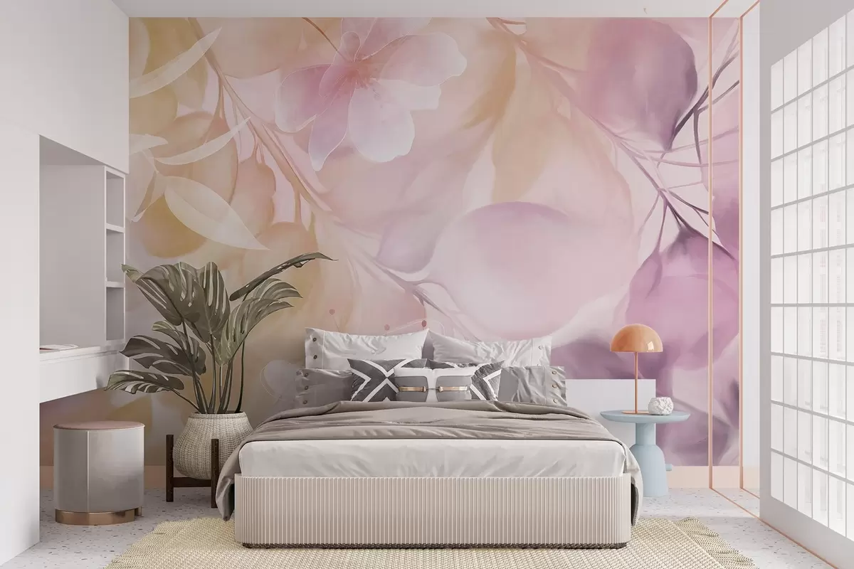 Тапете за зид Цветна уметност са пригушеним жутим и љубичастим цветовима, лишћем и гранама, меким пастелним бојама, ефектом текстуре акварела бр. w09397v2