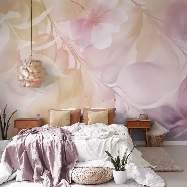 Тапете за зид Цветна уметност са пригушеним жутим и љубичастим цветовима, лишћем и гранама, меким пастелним бојама, ефектом текстуре акварела бр. w09397v2