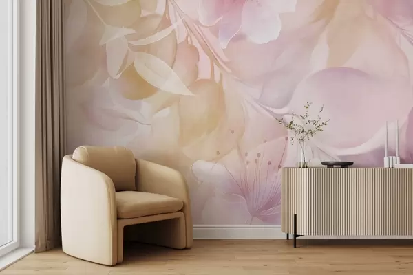 Тапете за зид Цветна уметност са пригушеним жутим и љубичастим цветовима, лишћем и гранама, меким пастелним бојама, ефектом текстуре акварела бр. w09397v2