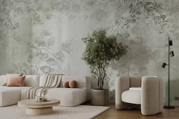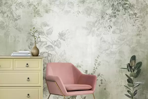 Тапете за зид Винтаге текстурирана цветна уметност са илустрацијама нежног баштенског цвећа и лишћа у стилу цртања, меки зелени тонови бр. w09402v2