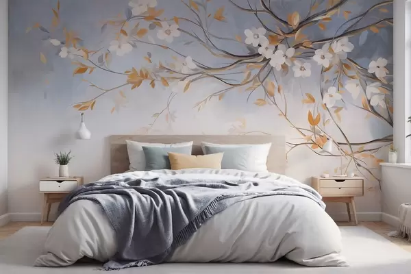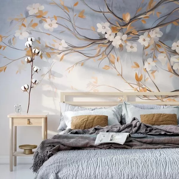 Тапете за зид Бело цвеће са наранџастим листовима на грани дрвета, светлоплава текстурирана позадина, нежни потези четкицом бр. w09415