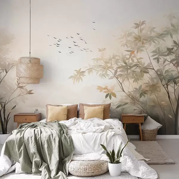 Тапете за зид Текстурирани пејзаж са дрвећем и јатом птица које лете небом, пастелне боје, природа бр. w09418