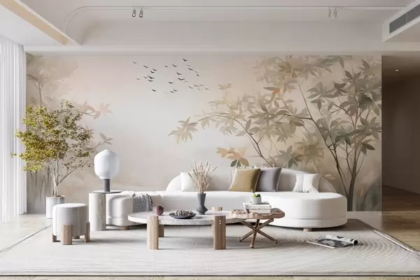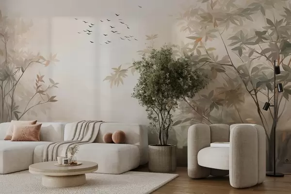 Тапете за зид Текстурирани пејзаж са дрвећем и јатом птица које лете небом, пастелне боје, природа бр. w09418