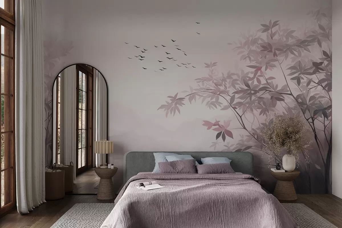 Тапете за зид Текстурирани пејзаж са дрвећем и јатом птица које лете небом, пастелне боје, природа бр. w09418v1