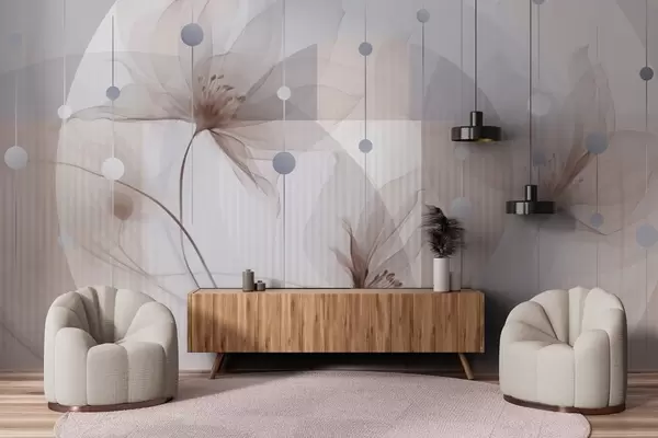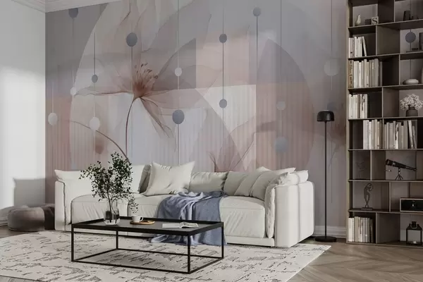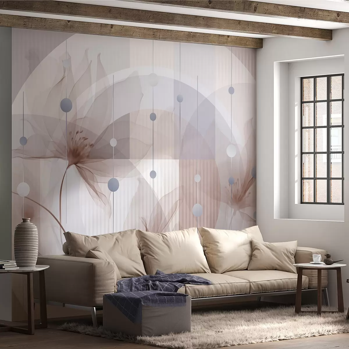 Тапете за зид Апстрактни провидни цветови, кругови и геометријски облици, пастелно плава, браон и бела палета боја бр. w09419v1