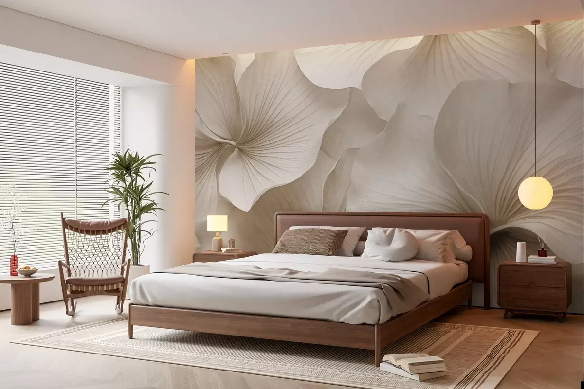 Тапете за зид Бели и беж листови гинка, мека текстура, апстрактна цветна позадина, минималистички модерни стил бр. w09421v1