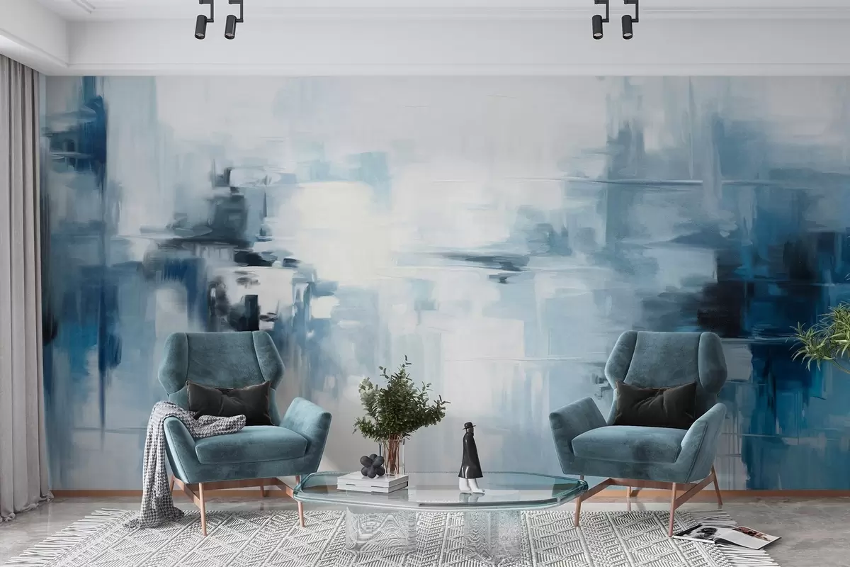 Тапете за зид Апстрактна текстурирана имитација пејзажног сликарства са плавим и белим потезима четкице, модерни стил бр. w09422