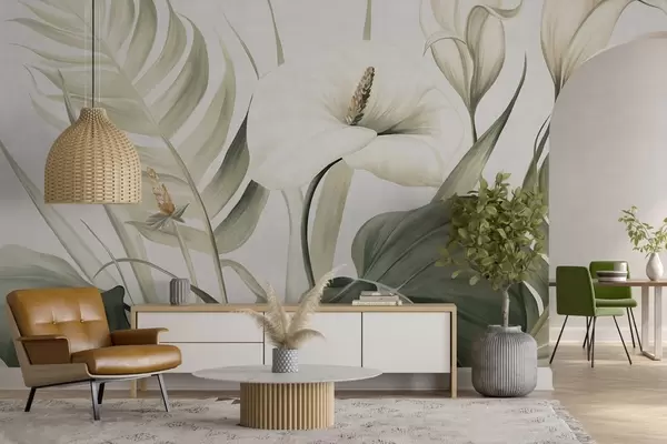 Тапете за зид Беле кале и зелено тропско лишће, ботаничка илустрација, светла позадина, винтаге стил, текстурирано бр. w09423
