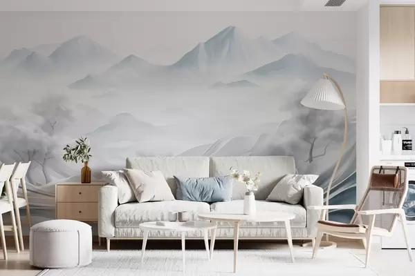 Тапете за зид Снежни апстрактни декоративни планински пејзаж са белим дрвећем и маглом, минималистички текстурирани стил бр. w09426