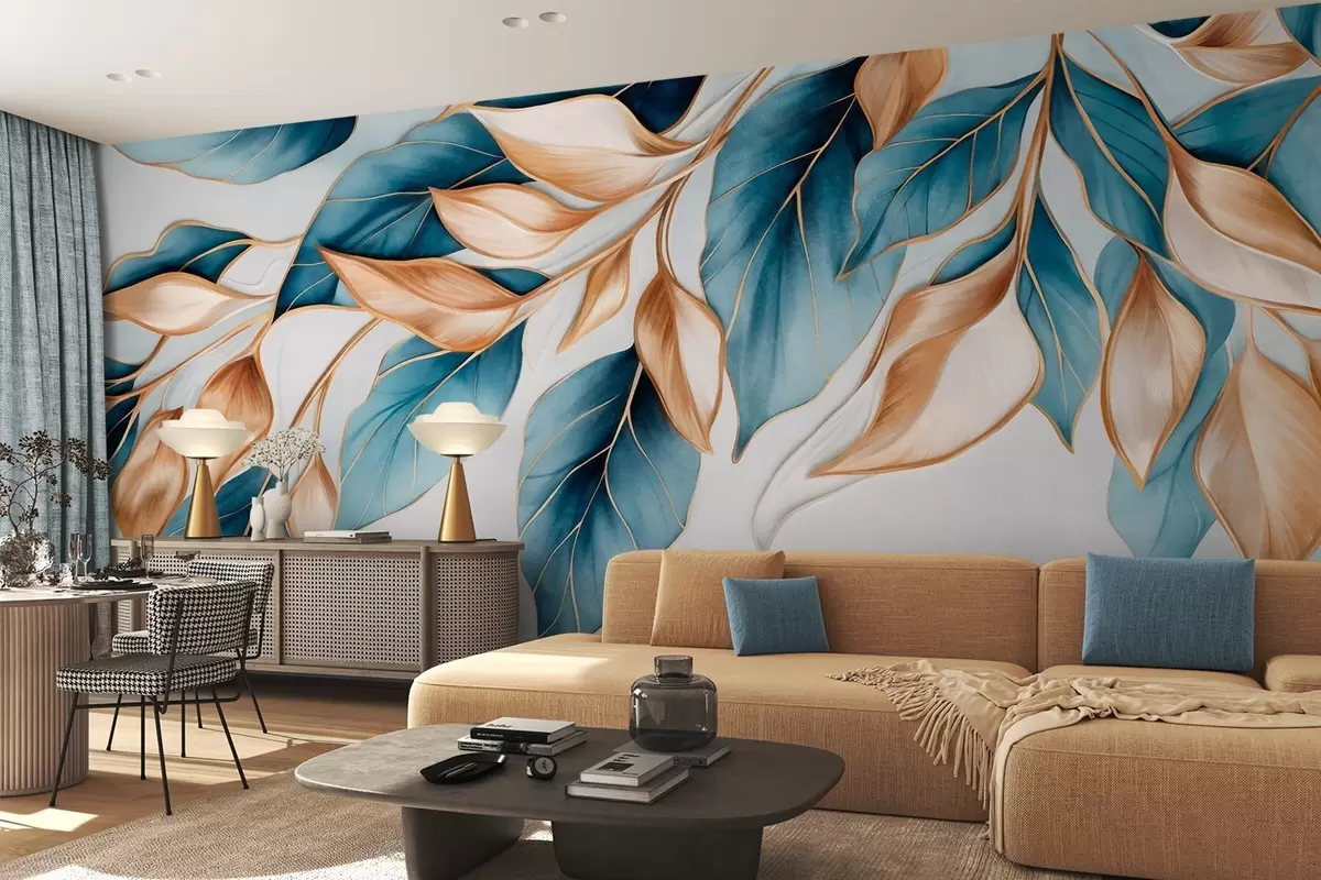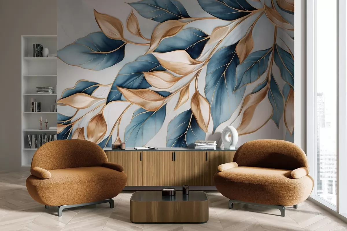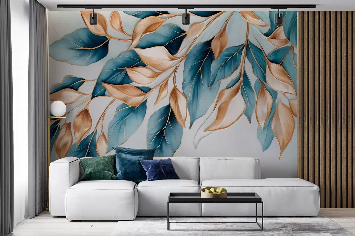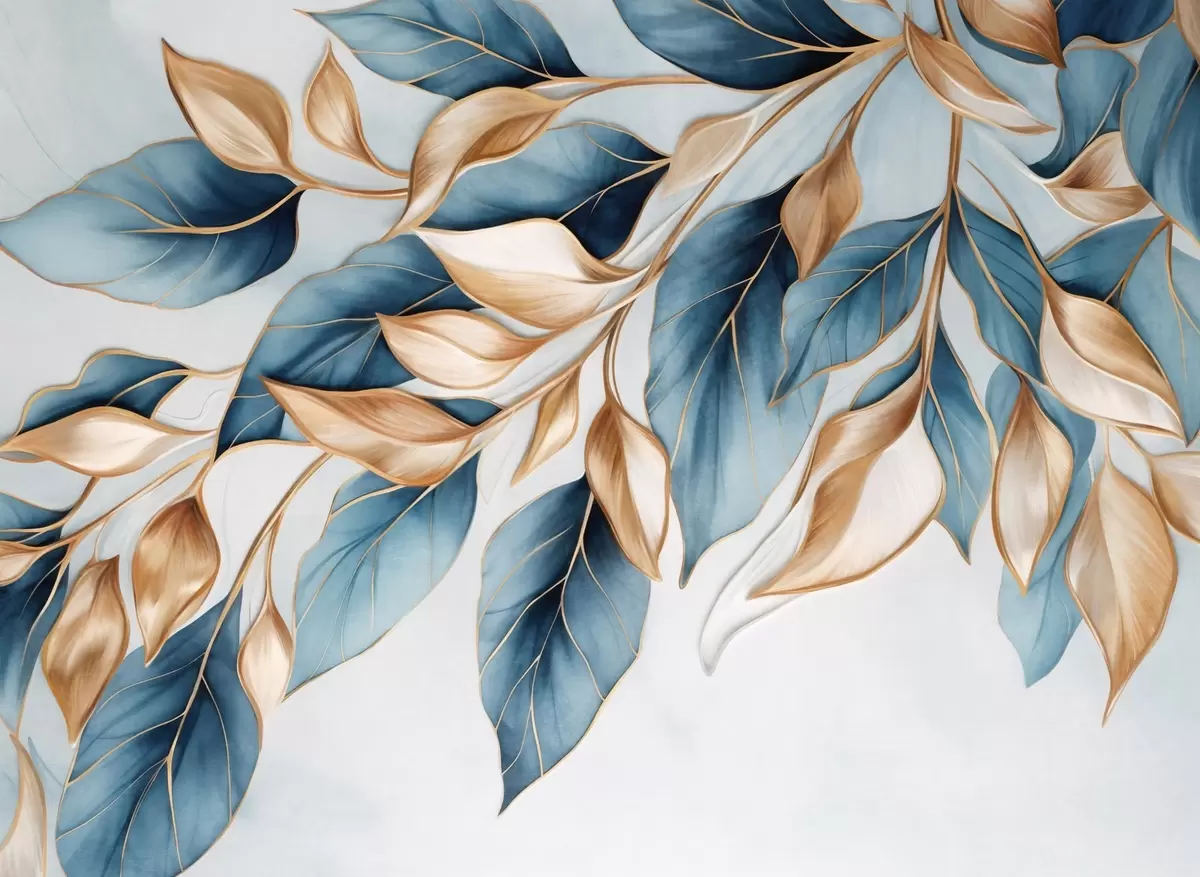 Тапете за зид Текстурирано плаво и наранџасто лишће, светлоплава позадина, елегантан и уметнички дизајн, модеран стил бр. w09429