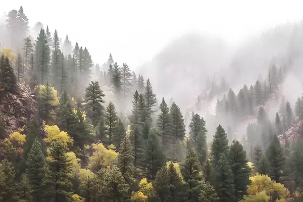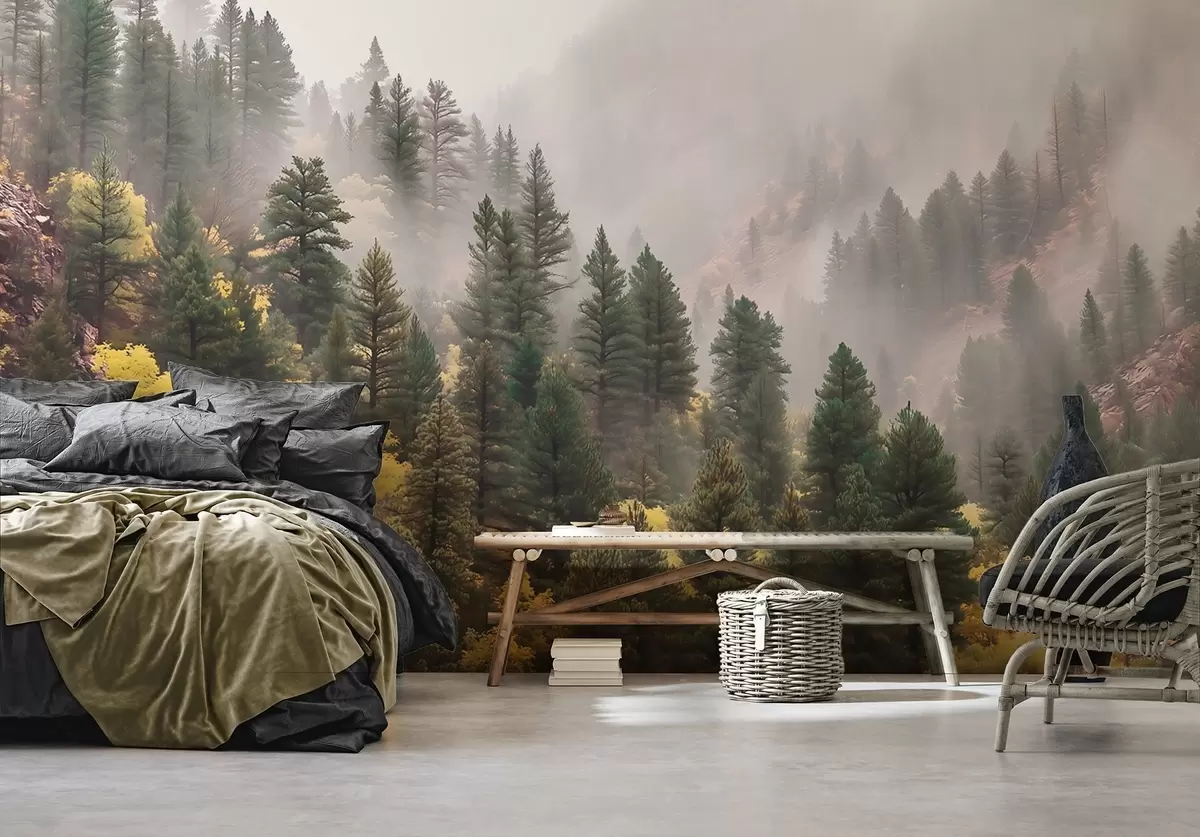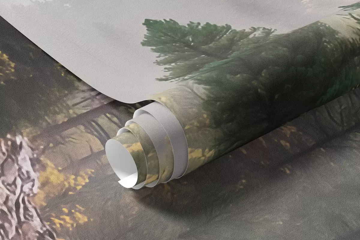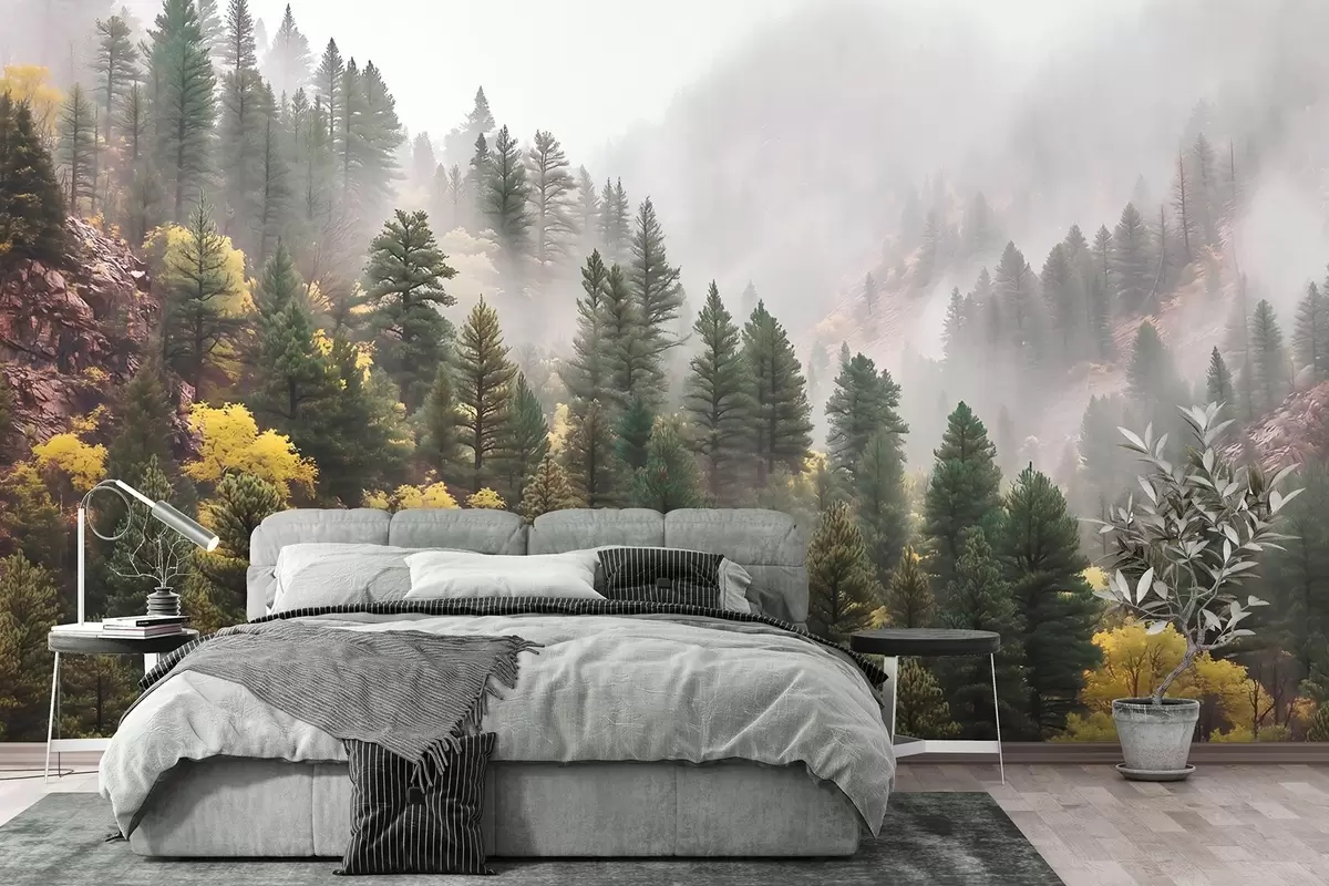 Тапете за зид Атмосферска магловита борова шума у планинама бр. w09463