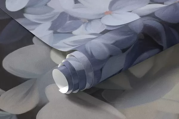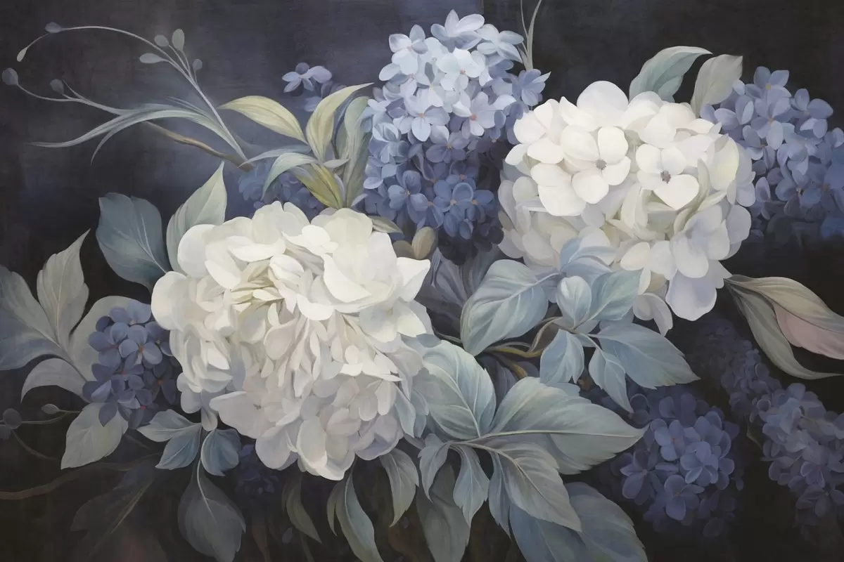 Тапете за зид Текстурирана тамноплава слика имитација цветова хортензије са великим листовима, апстрактна и тамна позадина бр. w09465v1