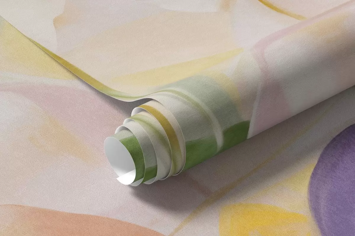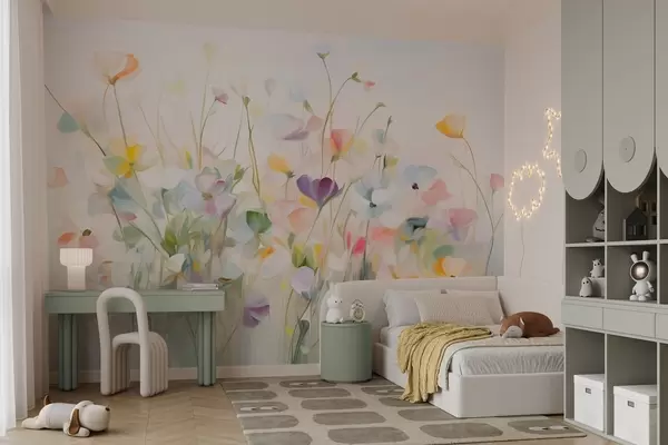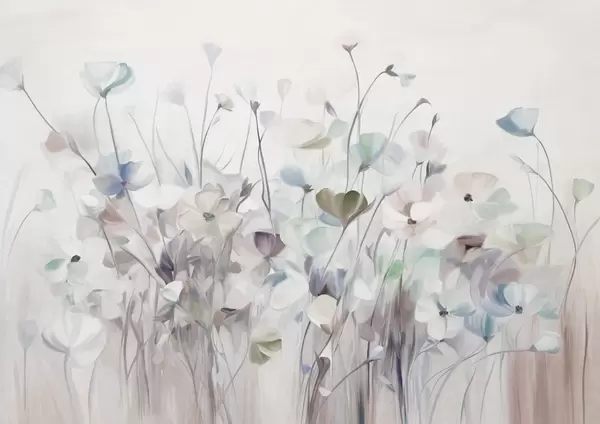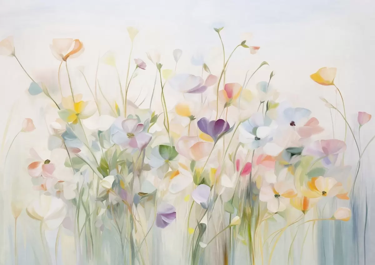 Тапете за зид Апстрактно поље шареног цвећа са дугим стабљикама и зеленим листовима, текстурирано, пастелно, светло бр. w09466
