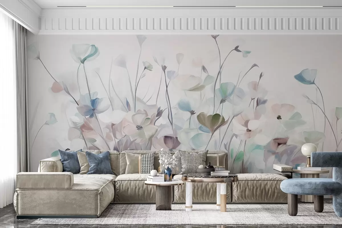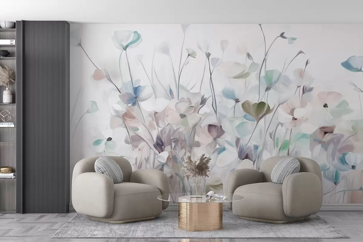 Тапете за зид Апстрактно поље плавих и смеђих цветова са дугим стабљикама и листовима, текстурираних, пастелних, пригушених боја бр. w09466v1