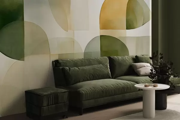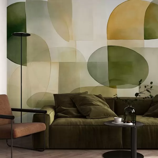 Тапете за зид Апстрактни текстурирани облици у нијансама зелене и жуте, пригушени тонови, минималистичка композиција, неутрална позадина бр. w09467