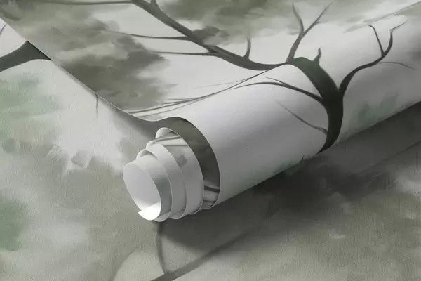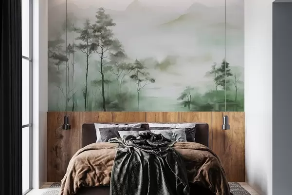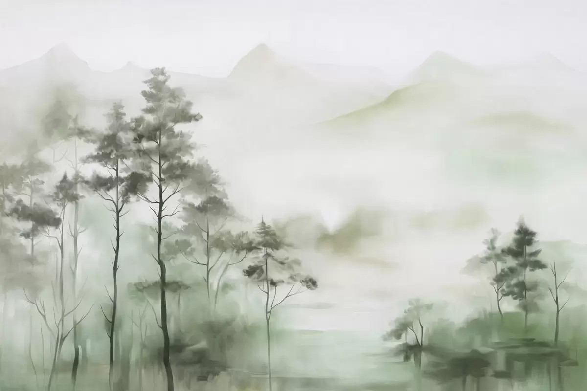 Тапете за зид Магловити пејзаж са високим дрвећем и планинама, пригушени зелени и сиви тонови, минималистички стил, текстуриран бр. w09469