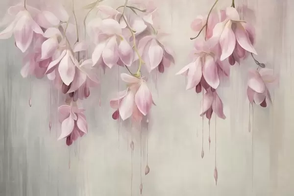 Тапете за зид Висеће ружичасто цвеће, светло сива позадина, цветни текстурирани аранжман, ботаничка уметност, пастелне боје бр. w09471
