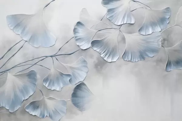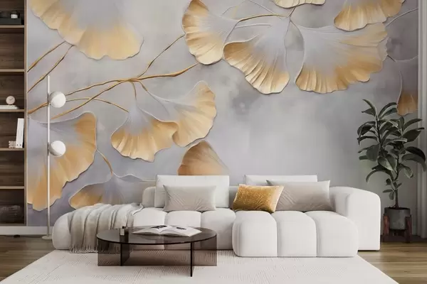Тапете за зид Листови гинка билобе са жутим ивицама на грани, сива текстурирана позадина, елегантан и минималистички дизајн бр. w09472