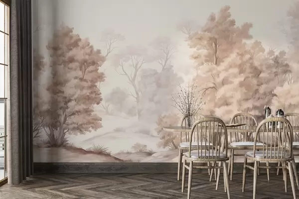 Тапете за зид Текстурирана пејзажна слика имитација шуме са високим дрвећем и травом, пригушене и меке боје, смирујућа сцена бр. w09474