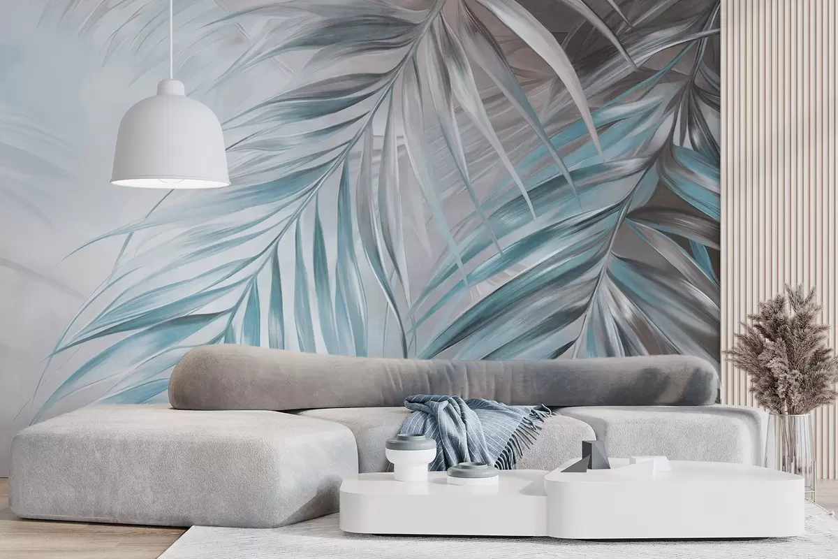 Тапете за зид Палмино лишће са сивим и плавим тоновима, светла текстурирана позадина са меким бојама, елегантан тропски стил бр. w09475v1