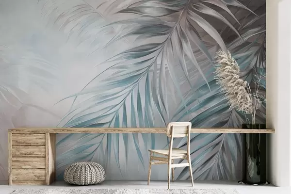 Тапете за зид Палмино лишће са сивим и плавим тоновима, светла текстурирана позадина са меким бојама, елегантан тропски стил бр. w09475v1