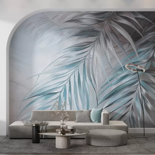 Тапете за зид Палмино лишће са сивим и плавим тоновима, светла текстурирана позадина са меким бојама, елегантан тропски стил бр. w09475v1