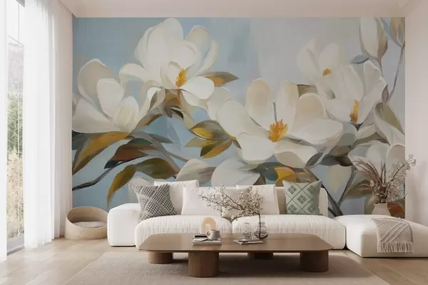 Тапете за зид Беле магнолије са зеленим листовима на светлоплавој позадини са имитацијом апстрактних потеза четкицом бр. w09478